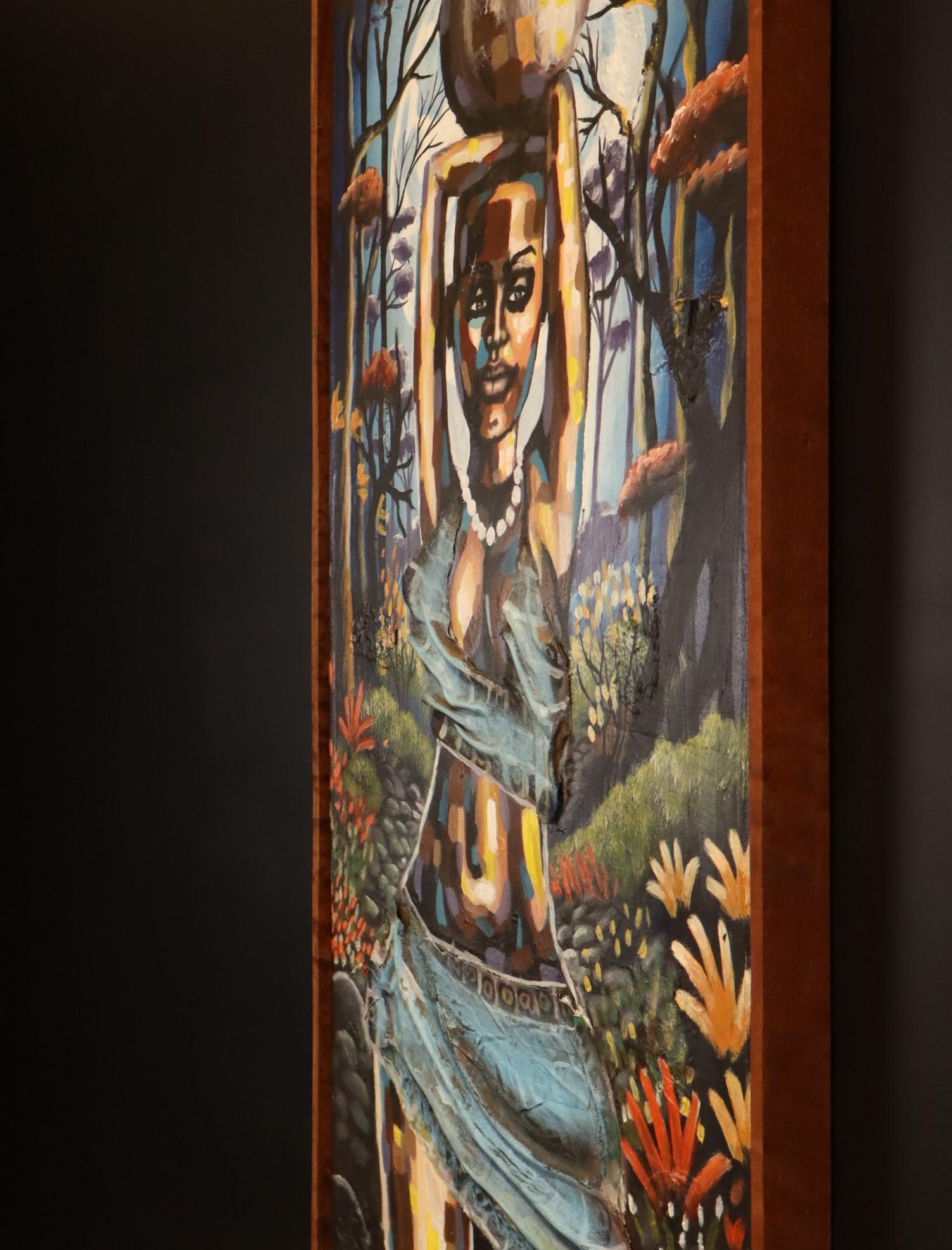 Set within a rich natural landscape, the painting blends deep forest tones, floral details, earthy highlights and abstract colour accents to create a striking visual story. The water vessel symbolises nourishment and life, while the graceful figure brings a sense of movement, heritage and cultural beauty to the composition.