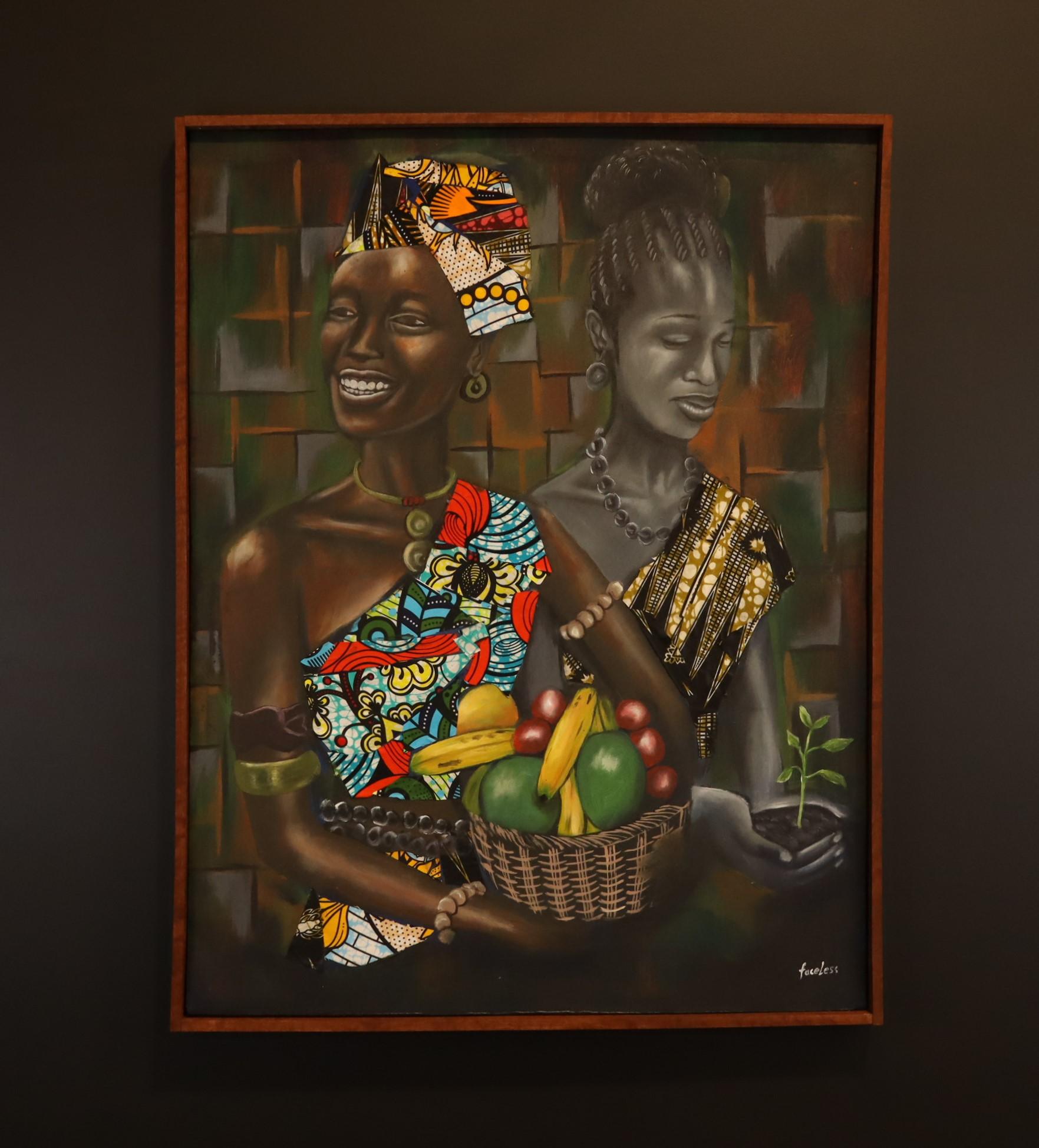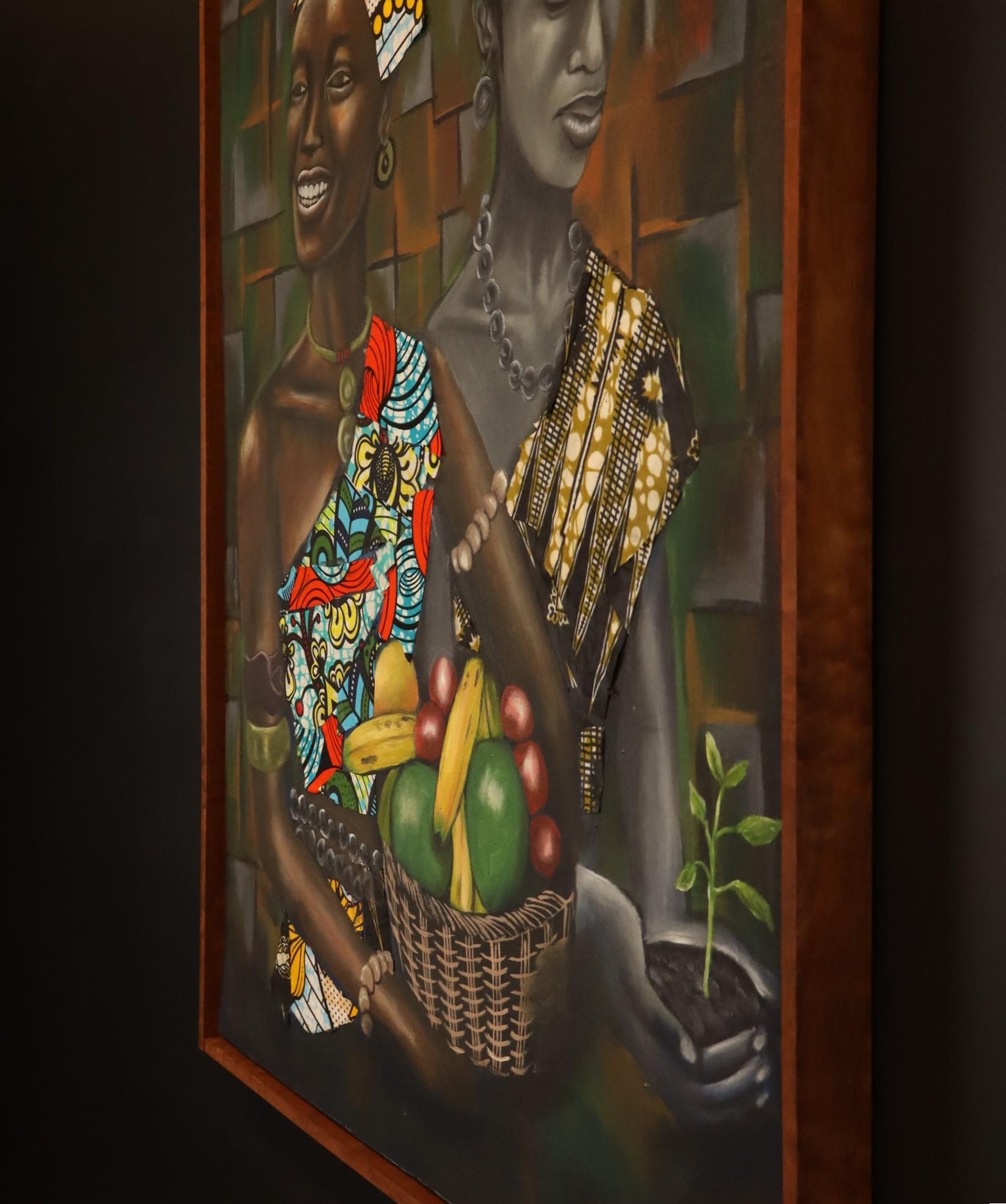 The composition combines rich earthy tones with vibrant African textile patterns, expressive portrait detail and a warm handcrafted finish. The colourful fabrics, fruit basket and delicate plant create a meaningful contrast between joy, prosperity and new beginnings, making this piece both decorative and deeply symbolic.