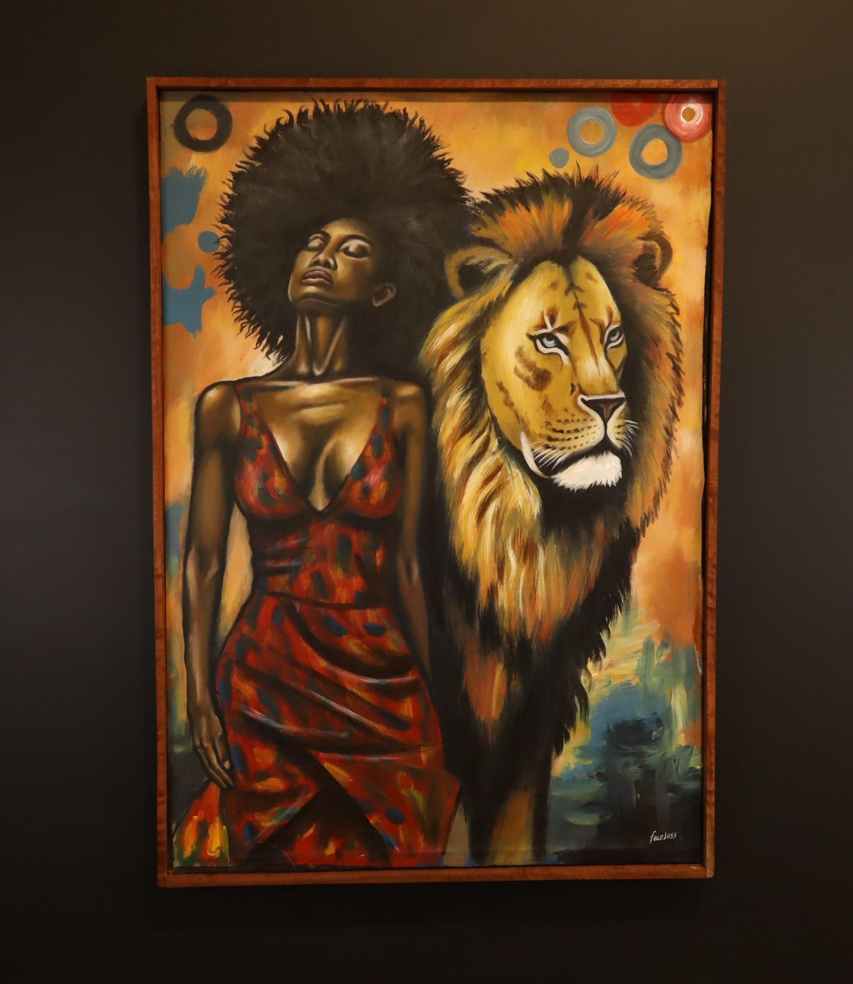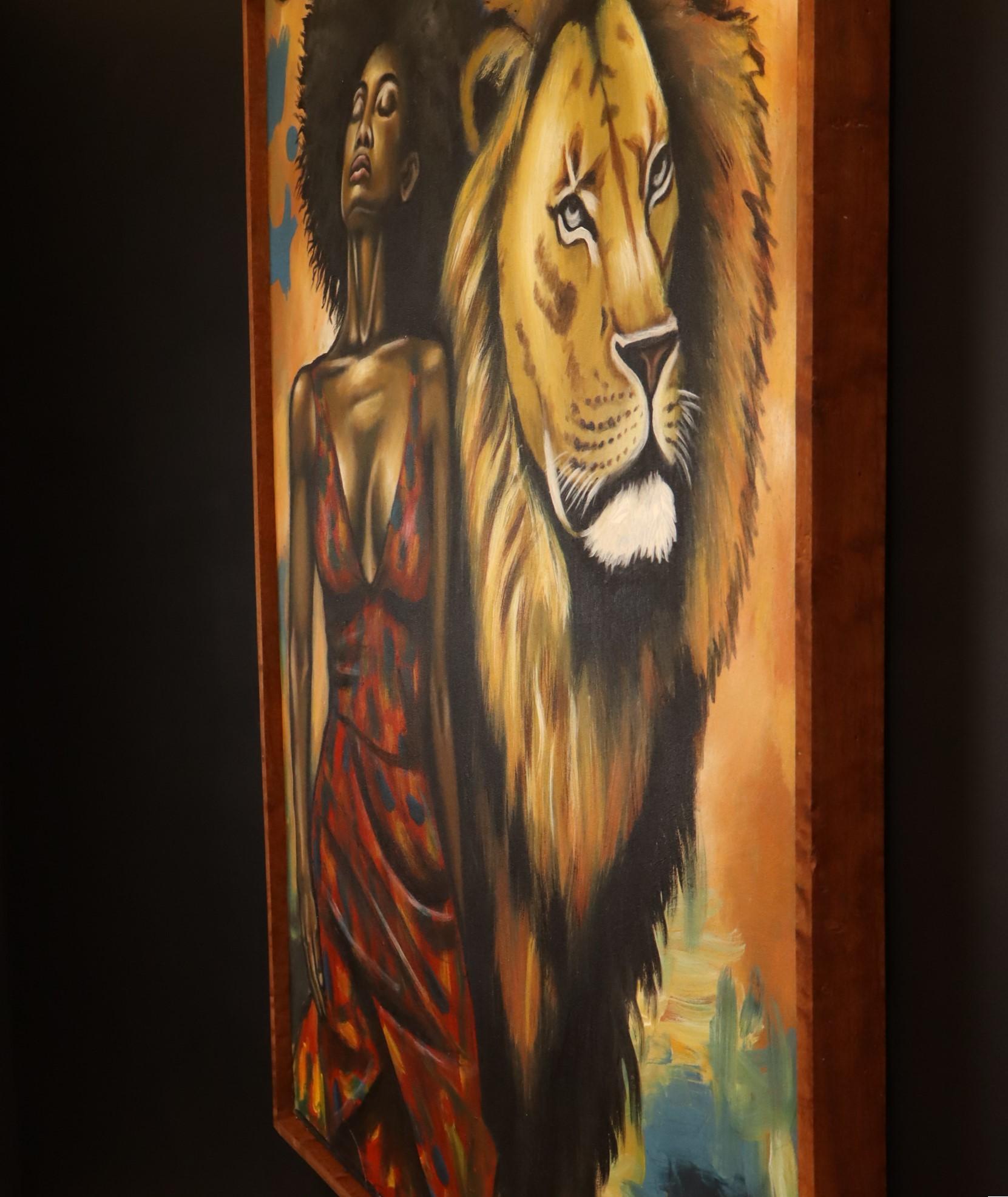 The painting combines warm golden tones, deep shadows and rich red accents, giving the piece a dramatic and confident presence. The woman’s poised expression and the lion’s commanding gaze create a bold visual story of protection, pride and natural power, making this canvas a memorable statement piece for any interior.