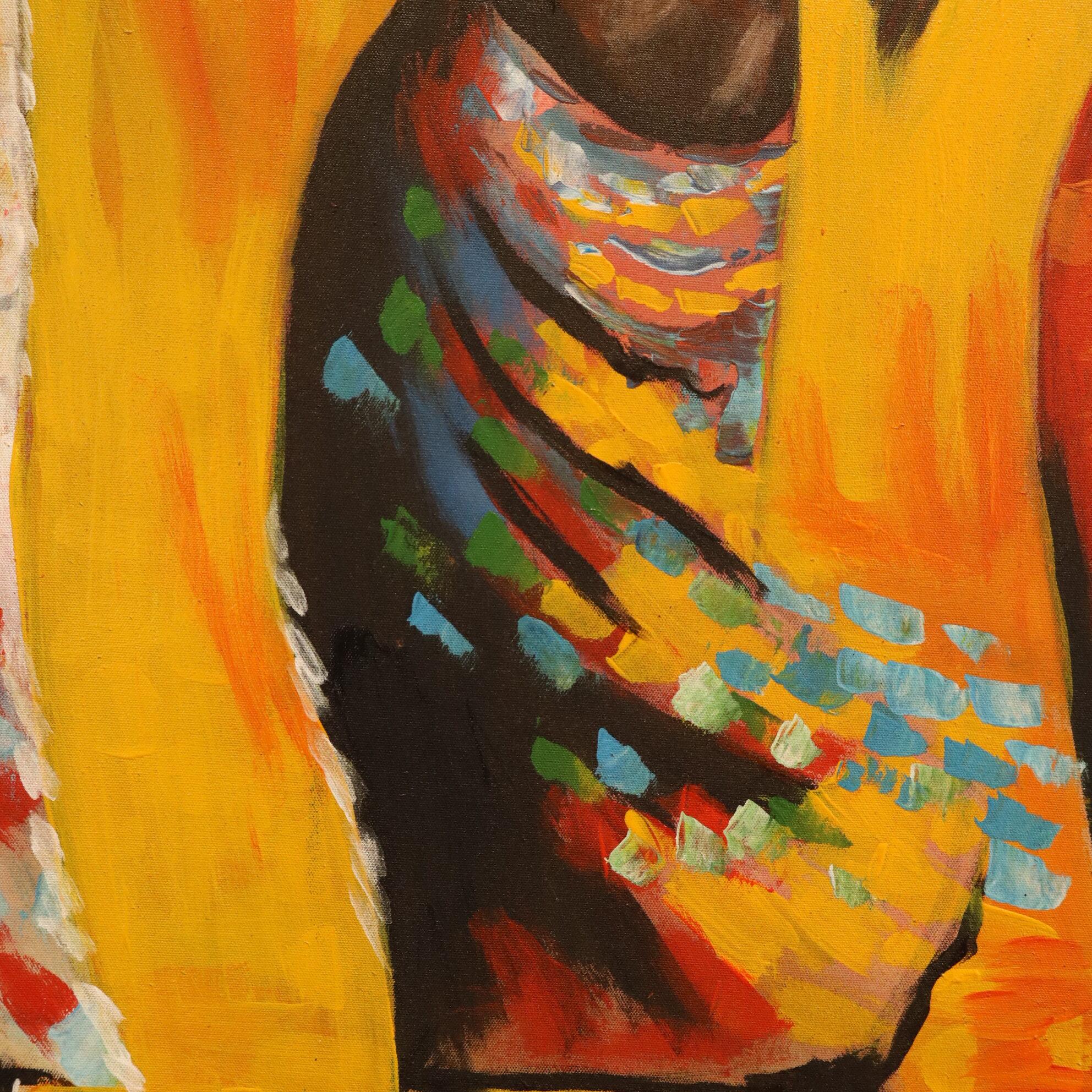 The painting blends rich reds, oranges and yellows with bold splashes of blue, green and white across the women’s flowing garments, creating a powerful sense of rhythm and life. The expressive brushwork and warm colour palette make this piece a striking statement for interiors that embrace culture, creativity and personality.