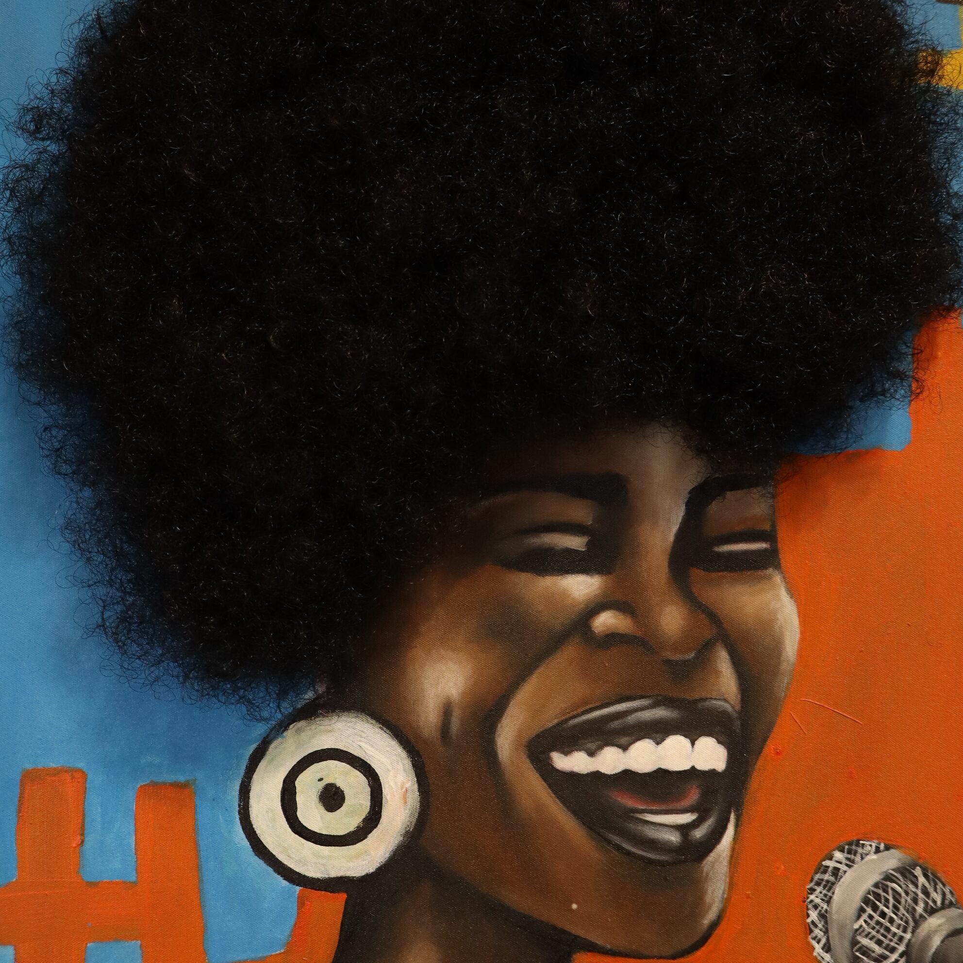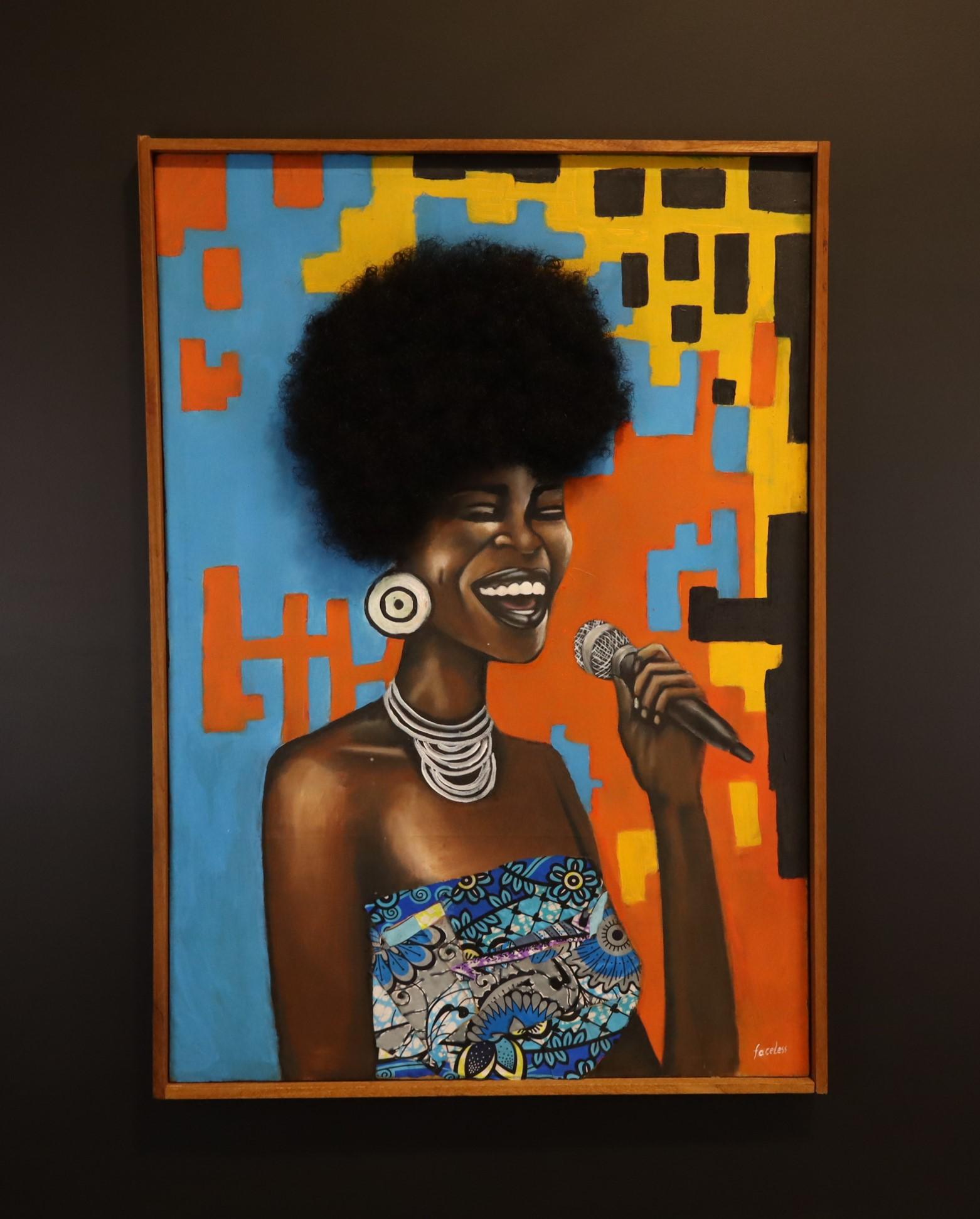 The star canvas, hand-painted with vibrant colours and finished with natural textiles, fabric, leather, yarn, accessories and artificial hair incorporated within the painting to bring it to life. making it stand out, will bring a happy and upliftting atmosphere to any environment. featured in an unfinished mahogany frame.
